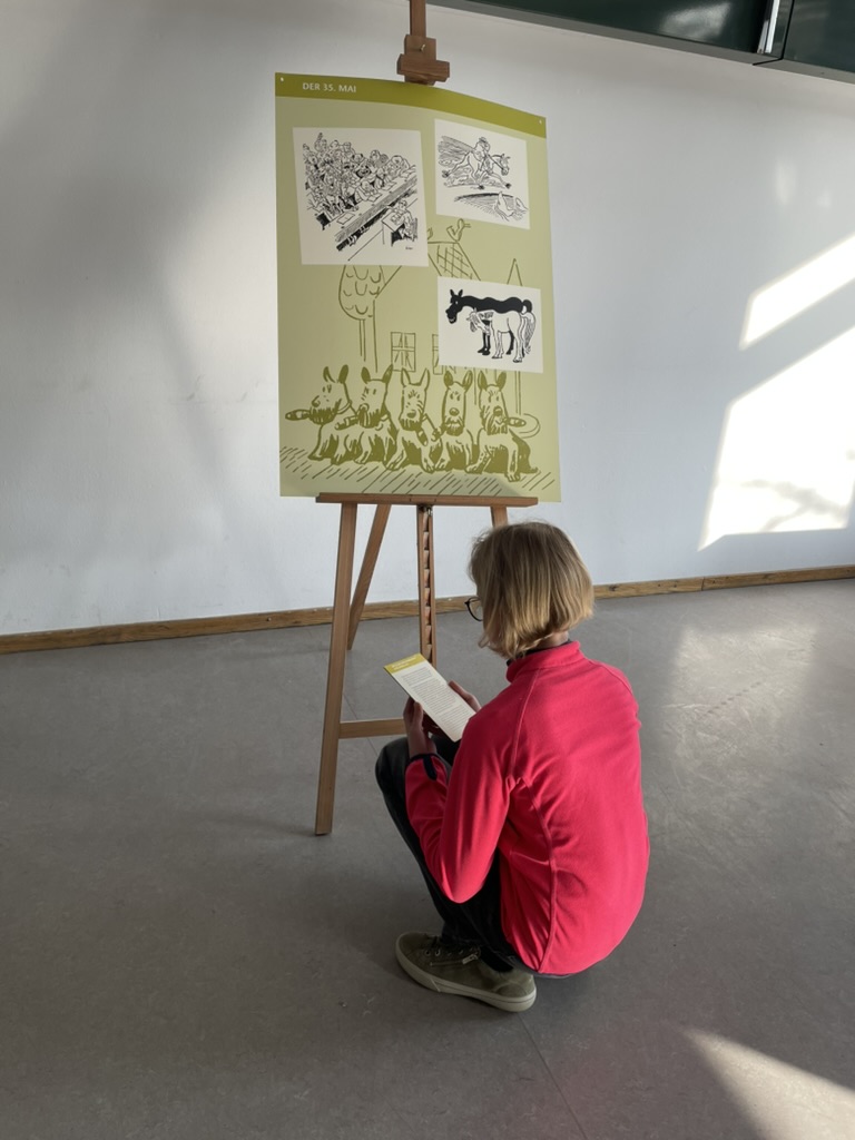 Im März gastiert die Ausstellung Walter Trier. Der frech-fröhliche Illustrator von Erich Kästners Kinderbüchern der Stiftung Internationale Jugendbibliothek nun am Anton-Bruckner-Gymnasium selbst. Die IJB besitzt die größte Sammlung von Originalillustrationen Walter Triers zu Erich Kästners Kinderbüchern in Europa; die Ausstellung umfasst 60 Originalillustrationen, von denen viele lange nicht mehr öffentlich zu sehen gewesen waren. Ein besonderer Blickfang ist das nachgebaute Cover von Emil und die Detektive. Begleitend bearbeiteten die Schülerinnen und Schüler ein Arbeitsblatt, das ihre Beobachtungen strukturierte und den Blick auf zentrale Merkmale von Triers Illustrationsstil schärfte.