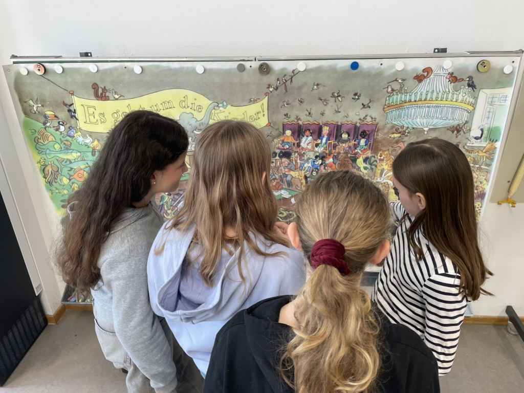 Den Ausgangspunkt bildete die Vorbereitung im Unterricht: Anhand eines Sachtextes erarbeiteten sich die Schülerinnen und Schüler die Grundzüge der Zusammenarbeit zwischen Kästner und Trier, die 1929 mit der Illustration von Emil und die Detektive begann und bis zu Triers Tod 1951 andauerte. Die Verlegerin Edith Jacobsohn hatte die beiden 1929 miteinander bekannt gemacht; insgesamt gingen aus der Begegnung dreizehn illustrierte Kinderbücher hervor. Ergänzt wurde diese Textarbeit durch eine Lesung: Gregory Charamsa las der Klasse Die Konferenz der Tiere vor — jenes Buch, auf das die Ausstellung einen besonderen Schwerpunkt legt. Kästner schrieb diese Politparabel 1949 nach einer Idee von Jella Lepman, der Gründerin der Internationalen Jugendbibliothek; Walter Trier illustrierte sie aus seinem Exil in Kanada. Dass dieser Text bis heute nichts an Aktualität eingebüßt hat, war im Unterrichtsgespräch deutlich zu spüren. Zur Sprache kam dabei auch die biographische Zäsur im Leben beider Künstler: Nach dem Aufstieg der Nationalsozialisten emigrierte der jüdische Künstler nach London und verbrachte seine letzten Lebensjahre in Kanada — illustrierte aber weiterhin aus dem Exil Kästners Bücher.