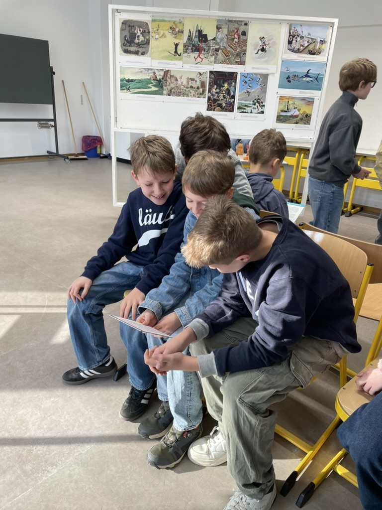 Den Abschluss bildete ein praktischer Versuch: Jedes Kind erprobte die sogenannte Triersche Diagonale am eigenen Bild — ein Kompositionsprinzip, das den Bildraum dynamisiert und den Blick des Betrachters führt. Ergänzt wird dieses Strukturelement durch klare, einfache Linien, einen spielzeughaften Charakter der Figuren und kräftige, leuchtende Farben, die Triers Illustrationen bis heute unverwechselbar machen. Was die Schülerinnen und Schüler bewundert hatten, versuchten sie nun selbst umzusetzen — mit Stift, Farbe und dem Blick für das, was ein Bild in Bewegung versetzt.