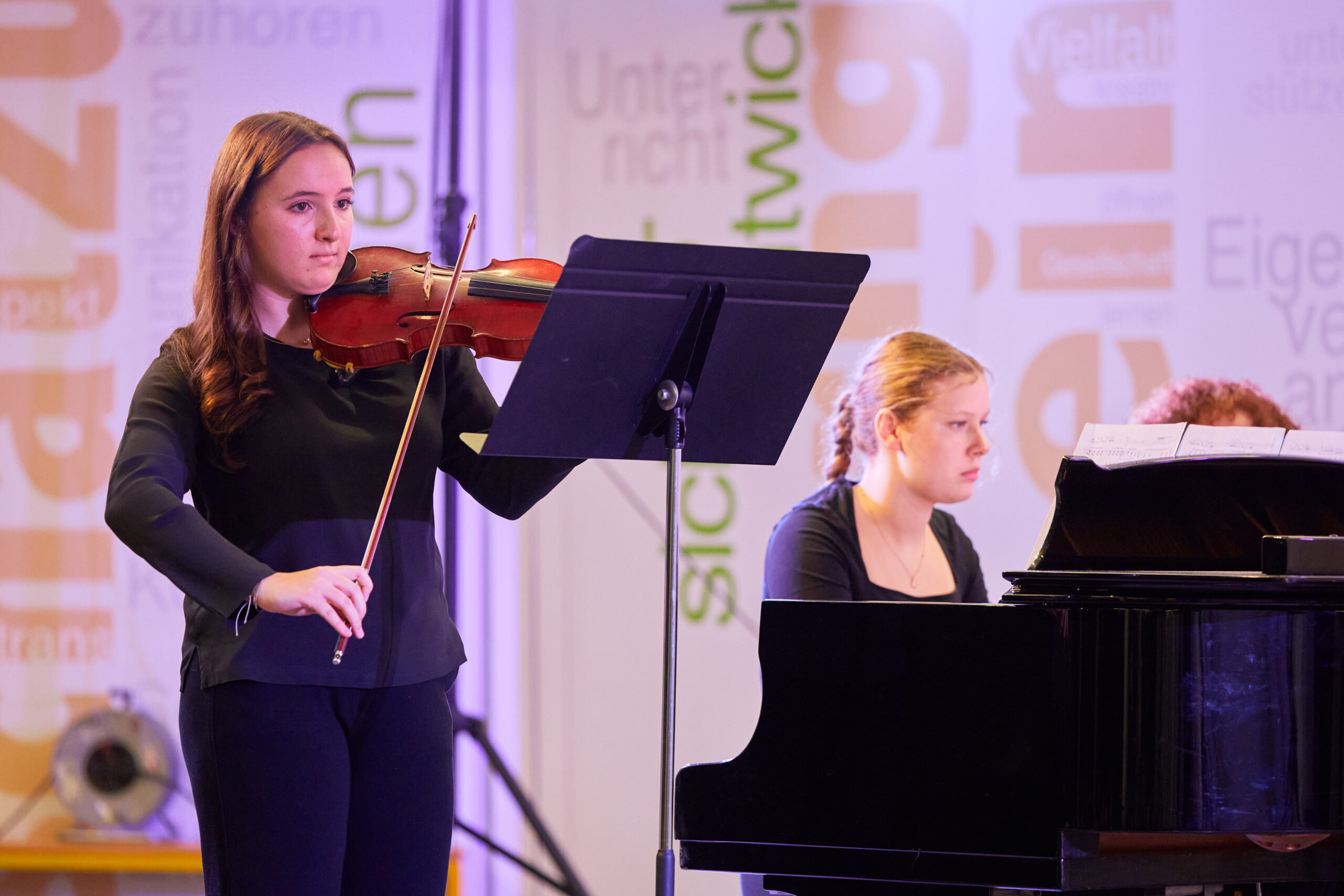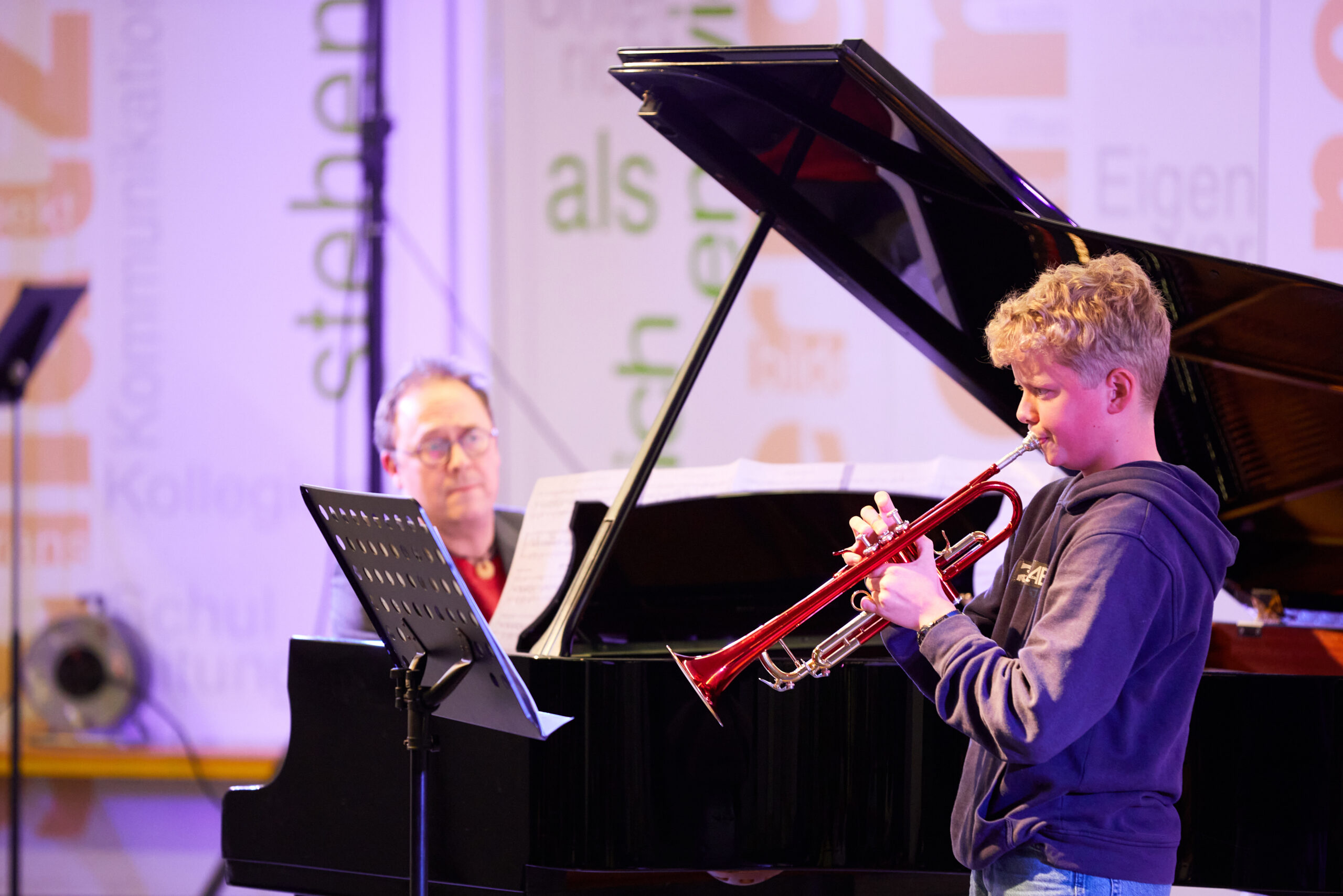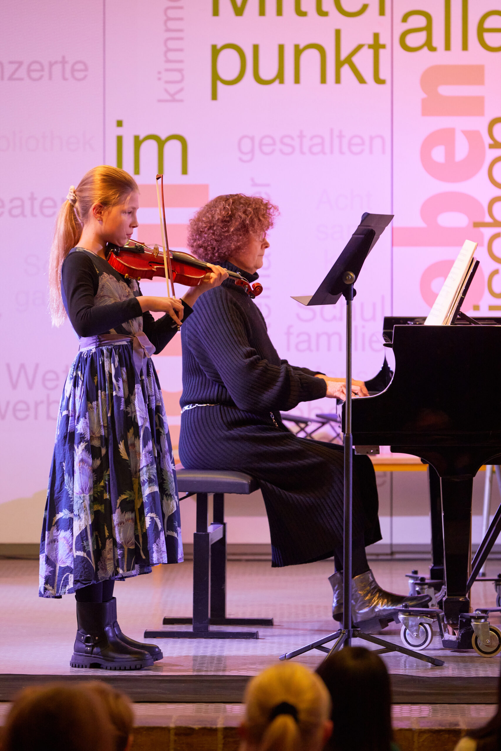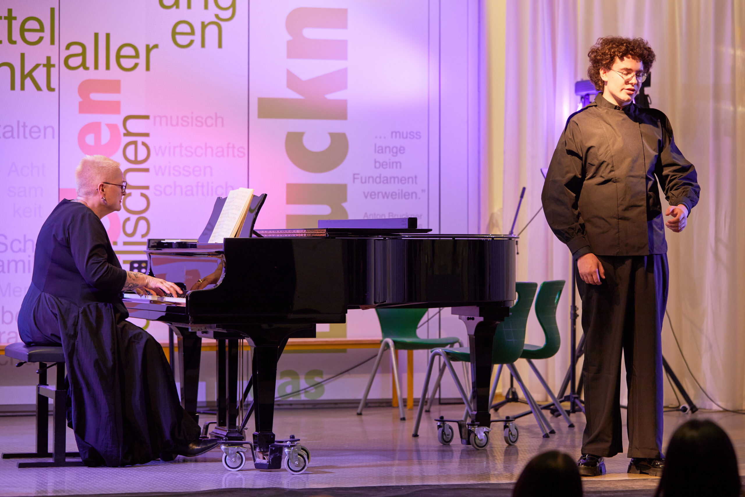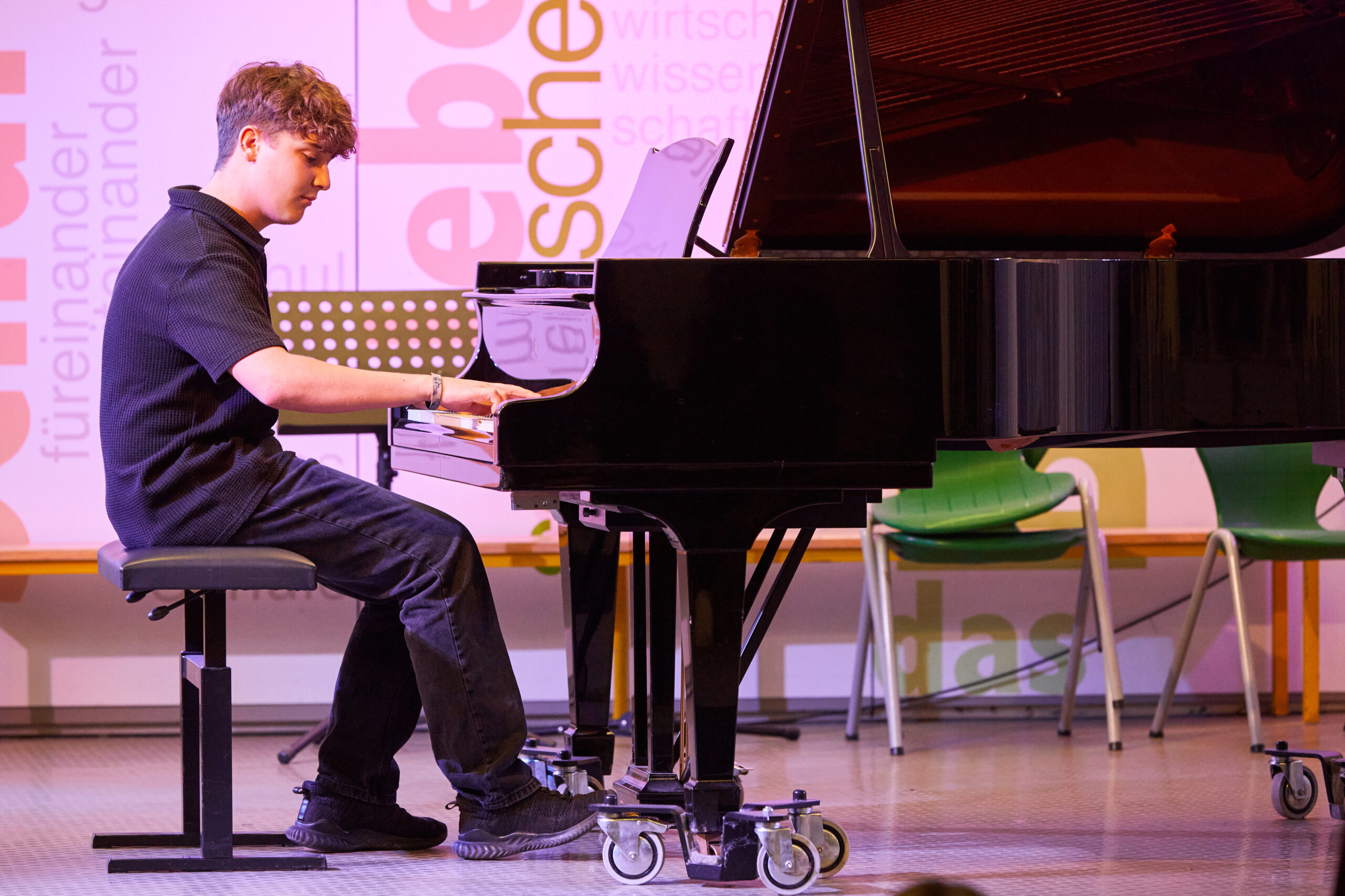 Die jüngsten Musikerinnen und Musiker der 1. Sternstunde besuchen erst seit wenigen Wochen den musischen Zweig und traten in der ABG-Aula mutig und mit beachtlicher Qualität auf. Eröffnet wurde das Konzert mit zarten Klängen der Gitarrenklasse von Aliosha de Santis, u.a. mit einem Ausflug zu den Piraten der Karibik. Aus der 5. Klasse glänzte Hannah Grumbeck an der Violine mit einem Satz aus dem G-Dur-Konzert von Carl Stamitz, von dem auch Julian Kammermeier einen Satz darbot (aus dem B-Dur-Konzert) – er überzeugte durch Stilsicherheit und klare Artikulation. Lucas Maier entfaltete bei Liszts „Ungarischer Rhapsodie Nr. 2“ sichtbare Freude an der pianistischen Virtuosität, bevor Max Hunger mit dem weichen Klang des Flügelhorns („Cantabile“) einen Ruhepol setzte. Mit einer besonders schönen Form des musikalischen Dialogs spielten Judith Hiendl (Klavier) und Magdalena Alt (Violine) das ebenso schlichte wie anrührende „Adagio lamentoso“ von Victor Karbajo wie aus einem Guss. Ein Höhepunkt der Sternstunde war der Überraschungsgast Veronika Troiber, die erst seit diesem Schuljahr im Leistungsfach Musik am ABG ist und sowohl mit Mendelssohns „Variations Serieuses“ am Klavier wie auch am Ende mit Bassis „Rigoletto-Variationen“ an der Klarinette ein fulminantes Feuerwerk ihres Könnens bot. Mehrfach begabt ist auch Magdalena Alt, die (nach einem schön gestalteten Satz für 2 Violinen aus Vivaldis Doppelkonzert mit Judith Hiendl) auch am Klavier glänzte – mit den Klangkaskaden aus Schuberts „Impromptu“ As-Dur. Schuberts Lied „An die Musik“ (instrumental ausgeführt mit Clara Roth, Violine und Teresa Scheungrab, Cello) mit dem Originaltext „Du holde Kunst…hast mich in eine bessre Welt entrückt“ wurde von Moderatorin Fr. Götz-Rigaud auch als musikalisches Motto für das kommende Schuljahr interpretiert. Die Vokalbeiträge (Mozarts „Veilchen“ mit Rino Hasegawa, zwei Wolf-Lieder mit Benjamin Schmitz und ein Song aus „Elisabeth“ mit Daniela Isaila) beeindruckten durch artikulatorisch klare und emotional intensive Gestaltung. Nach zwei weiteren anspruchsvollen Instrumentalbeiträgen (Griegs Cellosonate, virtuos gemeistert von Teresa Scheungrab, und ein „Danza argentina“ mit Maria Knott am Klavier) wurden die dankbaren Zuhörer mit einem jazzigen Ausklang auf den Heimweg geschickt: „Groove Joe“ (Zacharias Räß, Trompete und Andi Sobczyk, Klavier). Ein gelungener und wunderbar klingender Jahresauftakt am ABG!