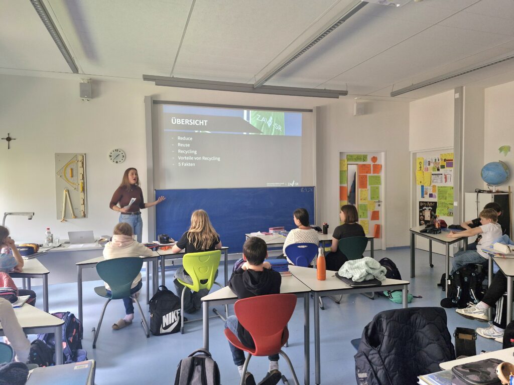 Am 14. April 2026 war Frau Anstadt vom Zweckverband der Abfallwirtschaft Straubing Stadt und Land zu Gast bei unseren beiden fünften Klassen im Ganztag. Im Mittelpunkt ihres Vortrags stand das bekannte Prinzip der drei R: Reduce, Reuse, Recycle. Zunächst ging es um Abfallvermeidung – warum sie wichtig ist, wie sie im Alltag gelingt und was eigentlich mit dem Restmüll passiert, wenn er unsere Schule oder unser Zuhause verlässt. Anschließend zeigte Frau Anstadt, wie sich viele Dinge wiederverwenden lassen, anstatt sie wegzuwerfen. Und schließlich erfuhren die Schülerinnen und Schüler, welche Wertstoffe in den Kreislauf zurückgebracht werden sollten und warum sich die sorgfältige Trennung wirklich lohnt.