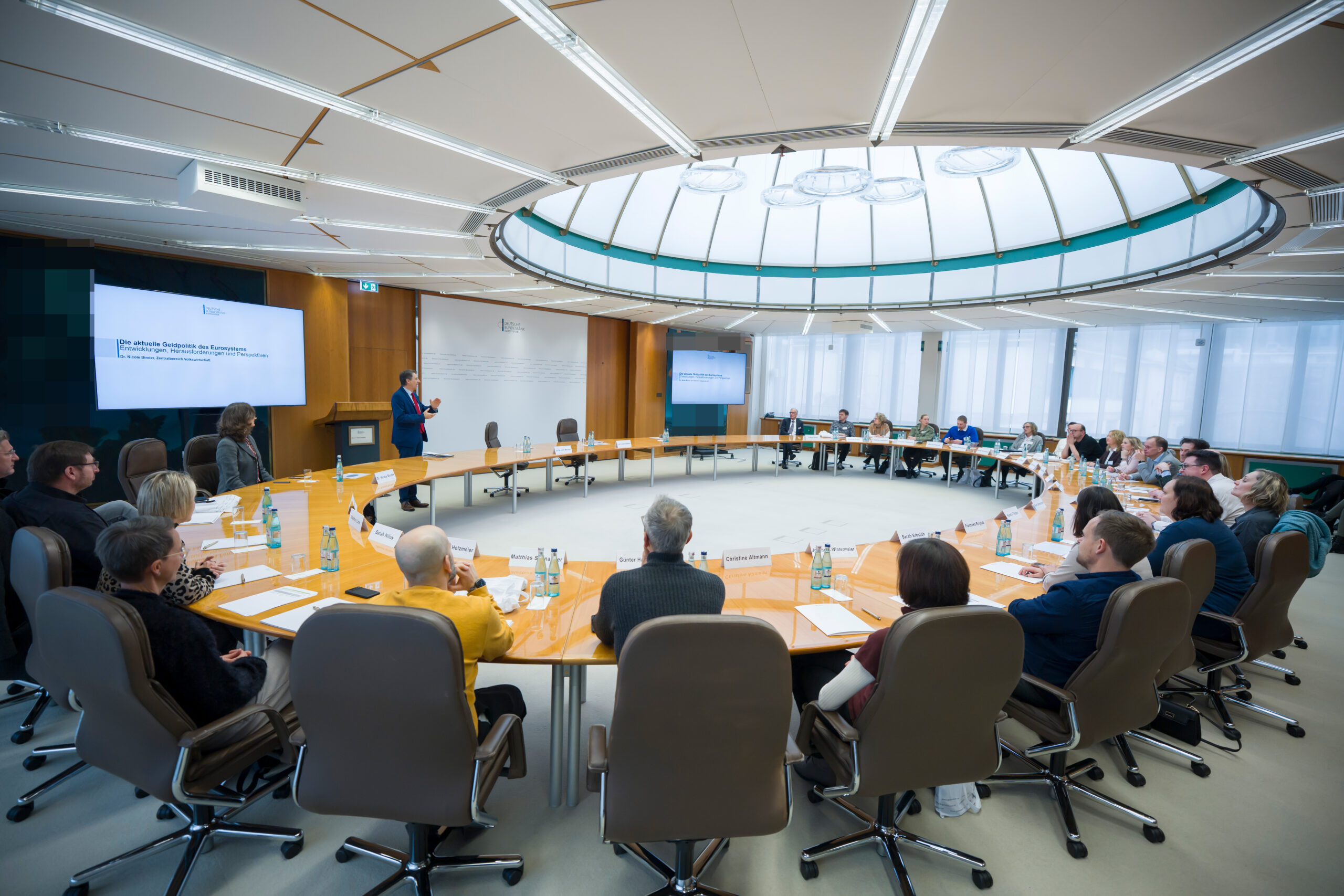 Anschließend ging es zur Hauptstelle der Bundesbank. Dort begrüßte Frau Dr. Nicole Binder die Gruppe und gab in einem Fachvortrag einen Überblick über Mandat und Unabhängigkeit der Europäischen Zentralbank sowie den geldpolitischen Transmissionsmechanismus. Während diese Inhalte für Wirtschaftslehrkräfte weitgehend bekannte Bestandteile des bayerischen Lehrplans darstellen, wurde es besonders gewinnbringend, als Frau Dr. Binder ihr eigenes Arbeitsgebiet vorstellte: die Messung der Effekte geldpolitischer Instrumente. Dabei wurde deutlich, wie komplex es ist, Wirkungen eindeutig nachzuweisen und zeitlich einzuordnen.