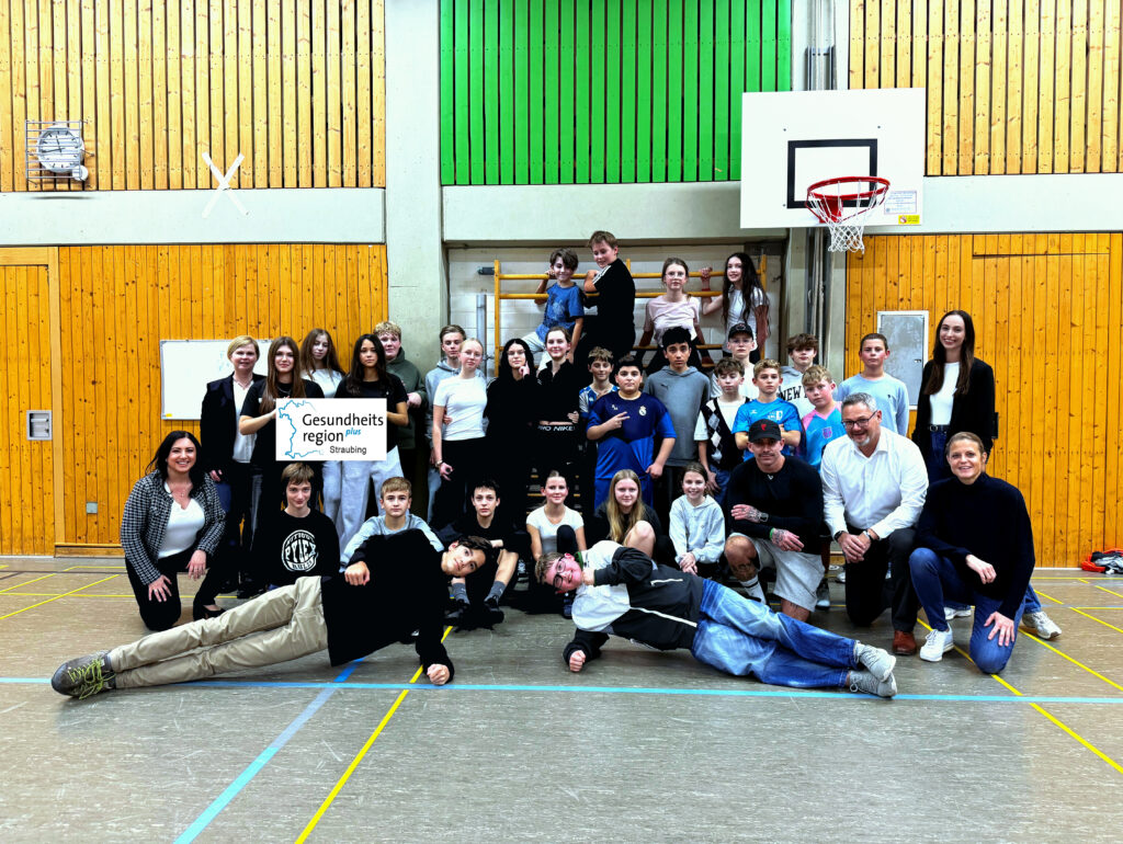 (Im Bild: Schülerinnen und Schüler des Anton-Bruckner-Gymnasiums zusammen mit Schulleiterin Dr. Eva Huller, OStRin Silke Rager sowie Markus Schuirer und Emily Fahn von der AOK, Sandra Krä (Gesundheitsregion plus) und Personaltrainer Giovanni Willudda )