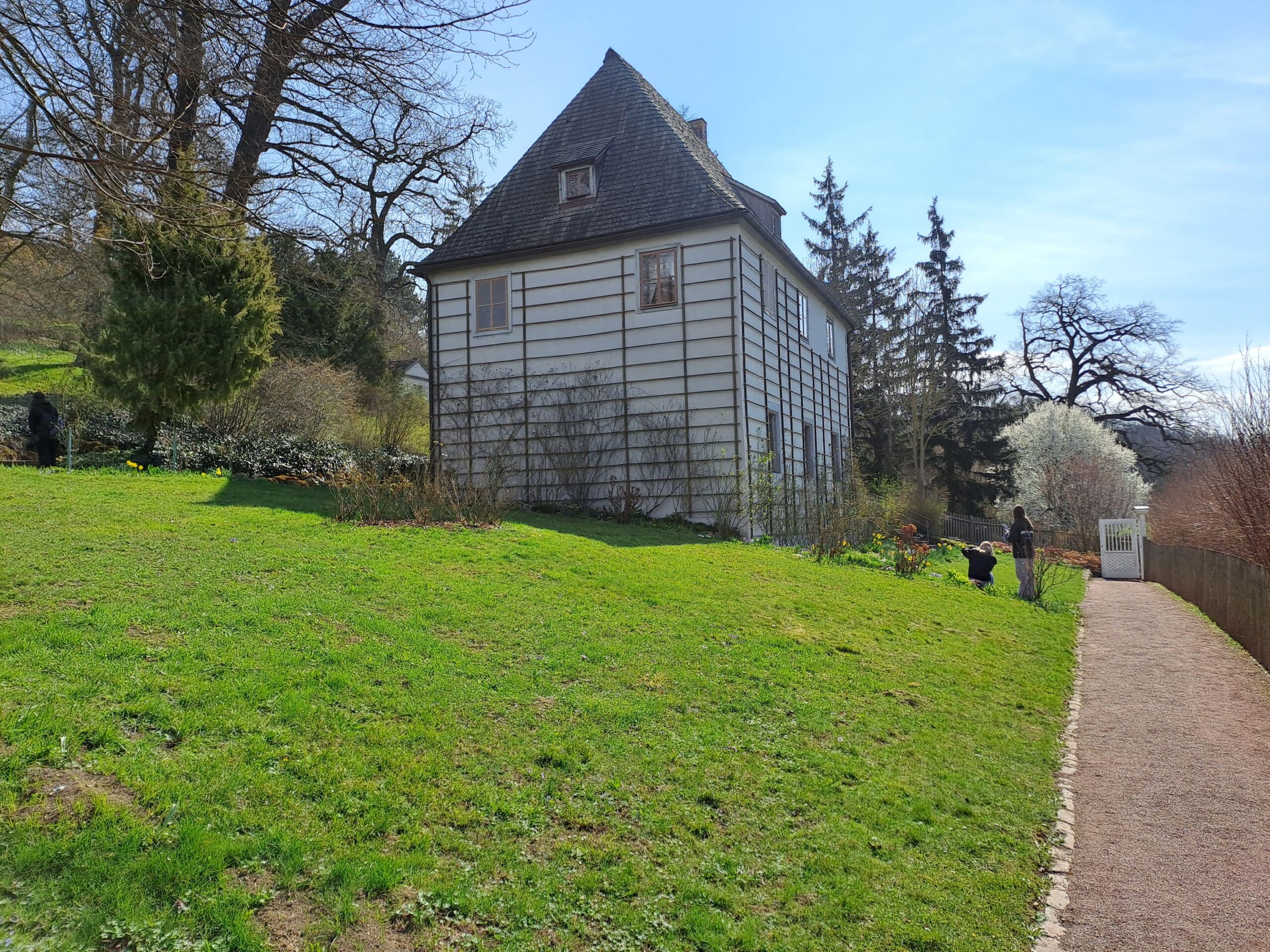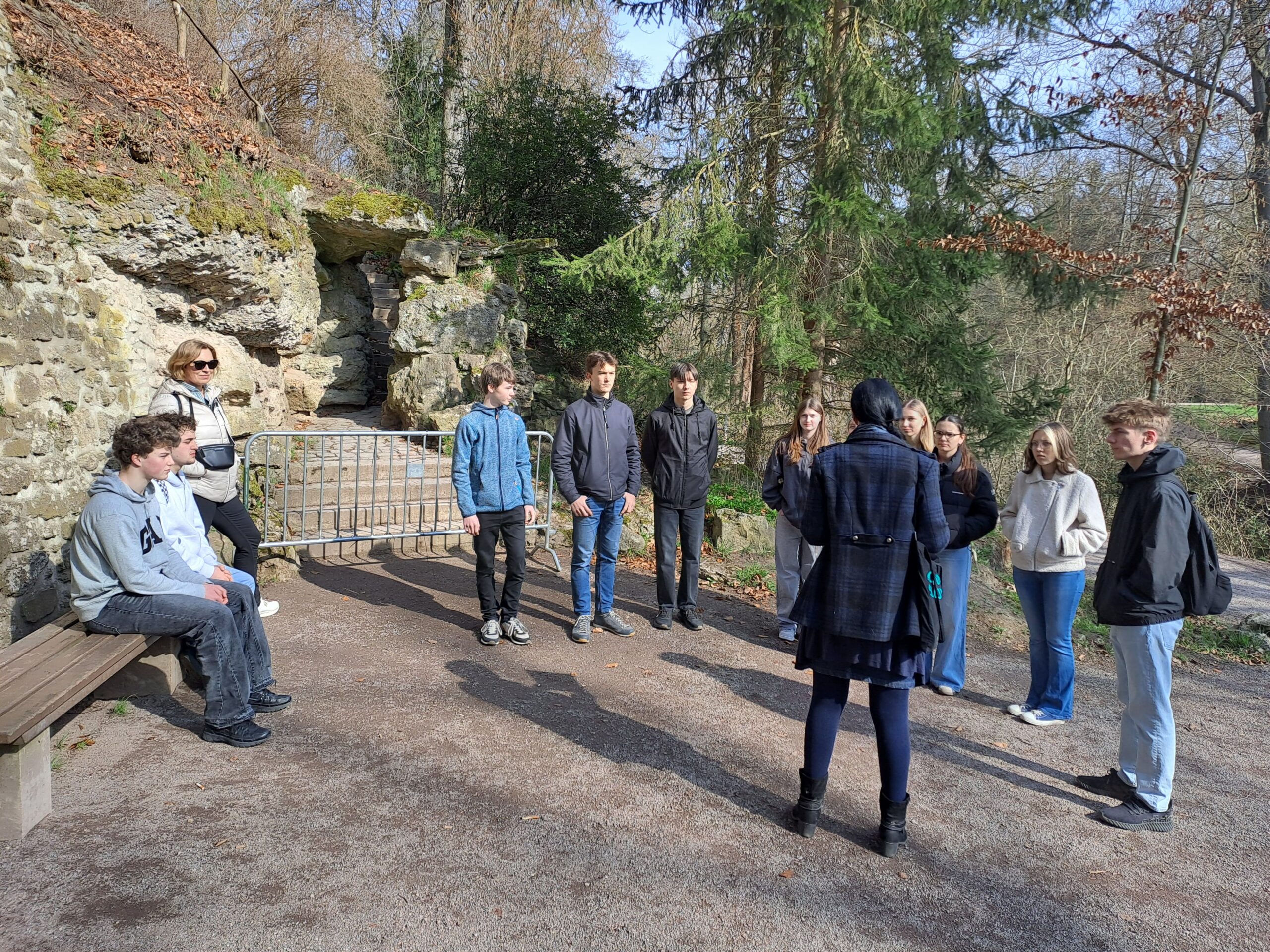 Der erste Tag begann mit strahlendem Sonnenschein und einer Erkundungstour durch den Park an der Ilm, der UNSECO-Weltkulturerbe ist. Während des Spaziergangs lernten die Schülerinnen und Schüler die Parklandschaft kennen, die Goethe beim legendären Osterspaziergang in seinem „Faust“ vor Augen hatte. Im Park selbst begegneten den Schülern Goethe und Schiller, und sie spielten am Shakespares-Eck, die die Naturbühne des Liebhaber-Theaters markiert, den Erl-König in Szenischer Lesung. Die Tour endete an Goethes Gartenhaus, das kurz vor dem Mittagessen, einer berühmten Thüringer Bartwurst, noch besichtigt werden konnte.